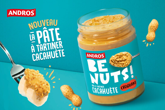 - Andros Be Nuts! Jeune, dynamique et décalée, c’est l’audace des nuts* dans des pâtes à tartiner onctueuse, aux recettes simples, protéinées et ultra-gourmandes. (*cacahuètes)